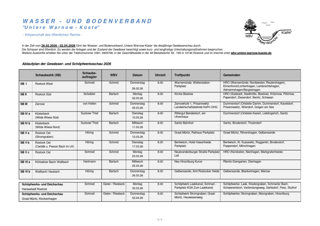 Bekanntmachung zur Gewässerunterhaltung Wasser- und Bodenverband „Untere Warnow-Küste“ / Termine der Gewässerschau