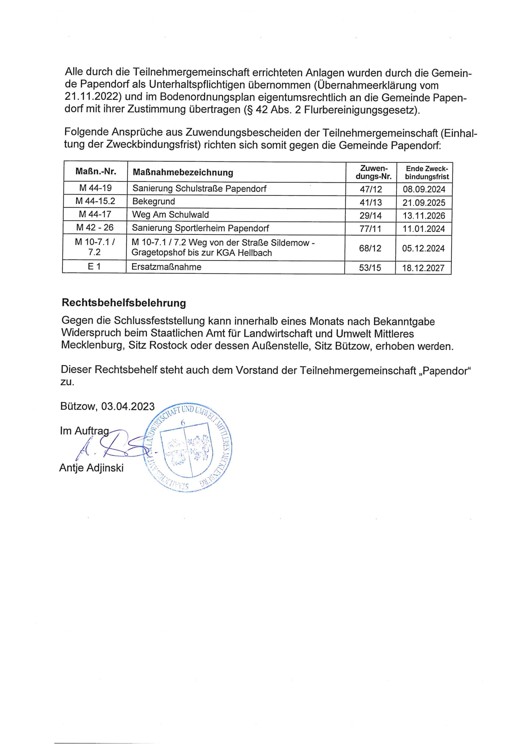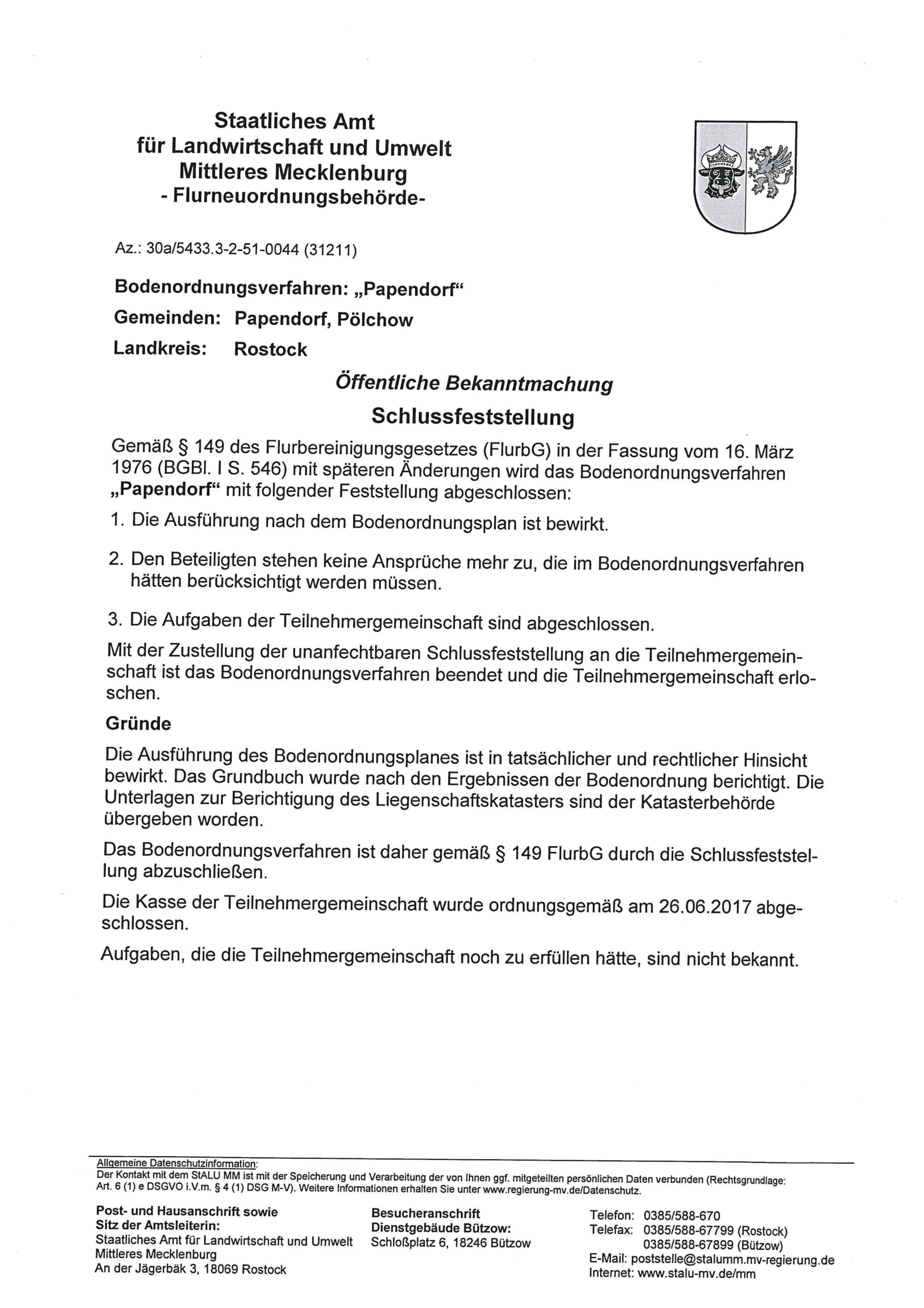Bodenordnungsverfahren Papendorf Staatliches Amt für Landwirtschaft und Umwelt Mitteleres Mecklenburg – Schlussfeststellung