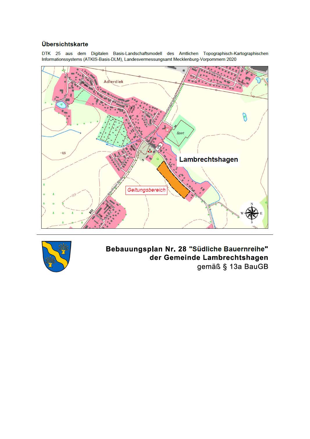 Die Gemeindevertretung Lambrechtshagen hat am 27.10.2022 den Bebauungsplans Nr. 28 „Südliche Bauernreihe“ als Satzung beschlossen und die zugehörige Begründung gebilligt. Der Beschluss wird hiermit gem. § 10 (3) BauGB bekannt gemacht.