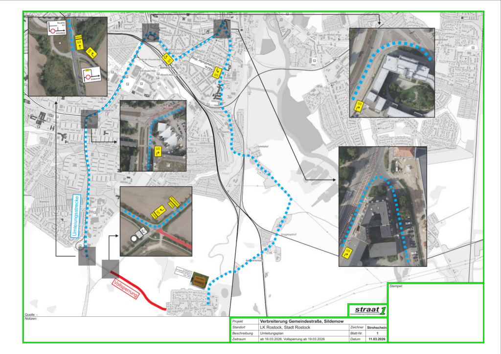 Ab Donnerstag, den 19.03.2026, 07:00 Uhr, bis voraussichtlich Freitag, den 10.04.2026, 17:00 Uhr, wird das Bauvorhaben „Verbreiterung der Straße nach Sildemow (2. Bauabschnitt)“ unter Vollsperrung durchgeführt.