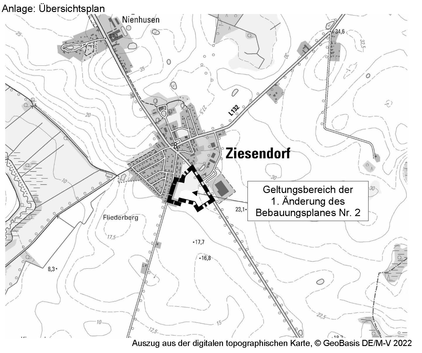 Die Gemeindevertretung der Gemeinde Ziesendorf hat in ihrer Sitzung am 16.11.2022 den geänderten Vorentwurf der 1. Änderung des Bebauungsplanes Nr. 2 für das „Wohn- und Mischgebiet Ziesendorf-Süd“ (ehemals „Gewerbegebiet I“) gebilligt. Das Planungsziel besteht darin, die Flächen für die Entwicklung von Allgemeinen Wohngebieten sowie von Mischgebieten planungsrechtlich vorzubereiten.