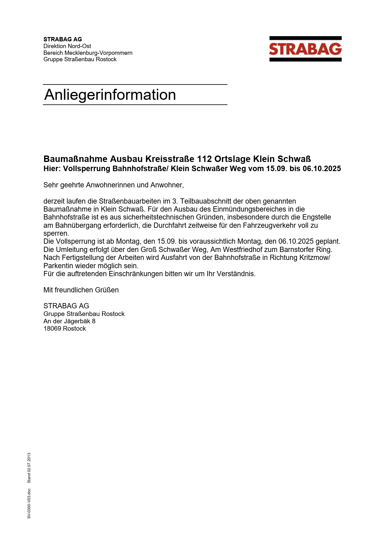 derzeit laufen die Straßenbauarbeiten im 3. Teilbauabschnitt der oben genannten Baumaßnahme in Klein Schwaß. Für den Ausbau des Einmündungsbereiches in die Bahnhofstraße ist es aus sicherheitstechnischen Gründen, insbesondere durch die Engstelle am Bahnübergang erforderlich, die Durchfahrt zeitweise für den Fahrzeugverkehr voll zu sperren.