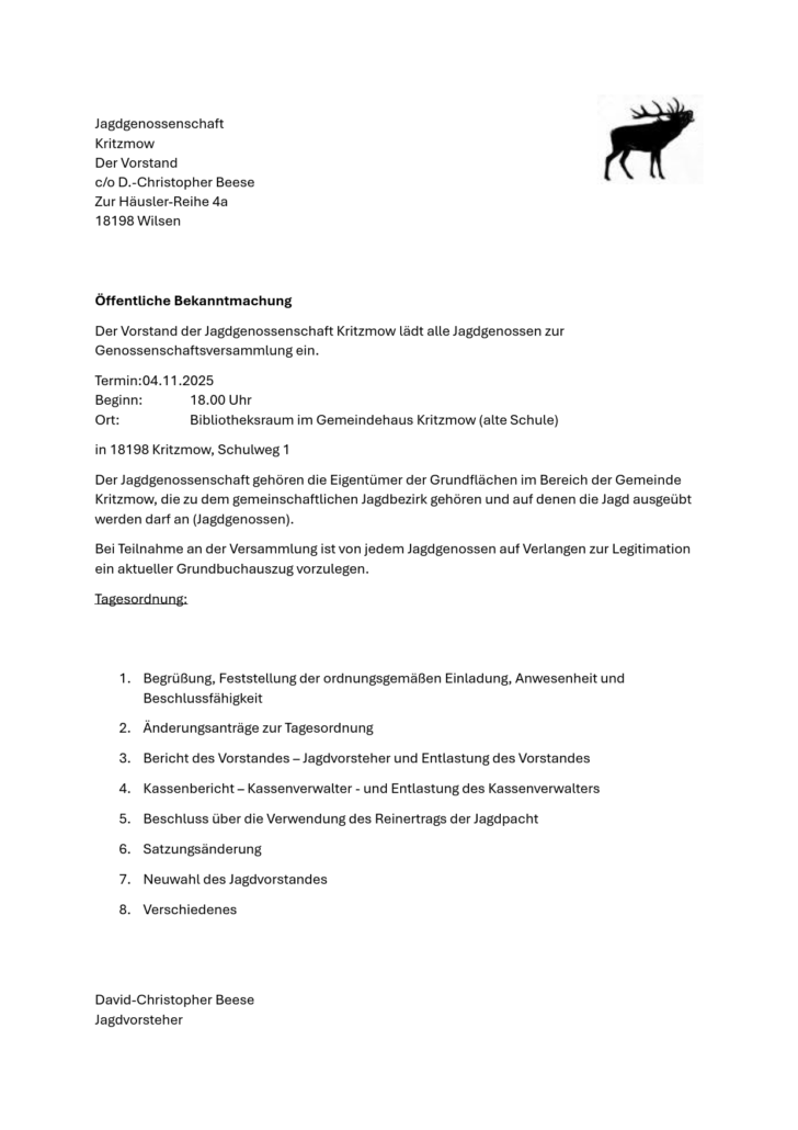Die Sitzung des Amtsausschusses Amt Warnow-West findet am Donnerstag, 23.10.2025 um 18:00 Uhr im Sitzungsraum im Amt Warnow-West, Schulweg 1 a, 18198 Kritzmow statt.